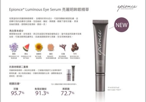 Epionce 亮麗明眸眼精華含多種獨特植物草本成分,可提亮嬌嫩的眼部肌膚,並逆轉可見的皮膚老化跡象,包括細紋、皺紋、黑眼圈、眼瞼下垂和浮腫。柔滑如絲的質感,使明眸回復清新、眼前一亮!