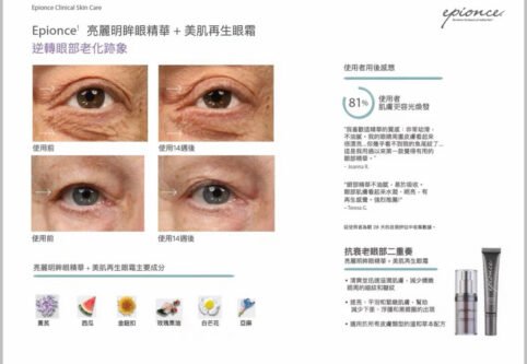 經臨床測試結果顯示同時使⽤亮麗明眸眼精華及美肌再生眼霜14週後,眼週衰老問題得到⾼度改善,除了可滋潤和撫平眼周肌膚,更可減少魚尾紋皺紋、浮腫和黑眼圈的出現,讓雙眼看起來更明亮、更年輕。